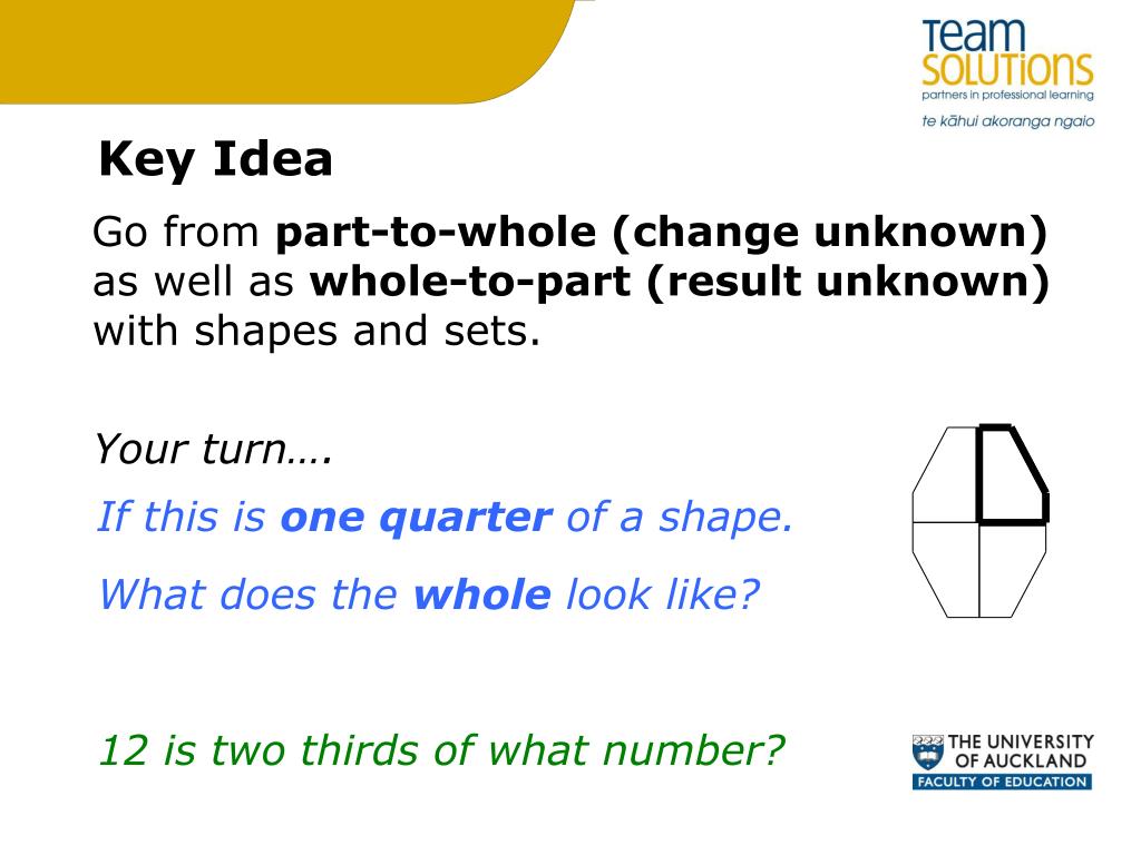 Key Idea Go from part-to-whole (change unknown) as well as whole-to-part (result unknown) with shapes and sets. Your turn…. If this is one quarter of a shape. What does the whole look like? 12 is two thirds of what number?