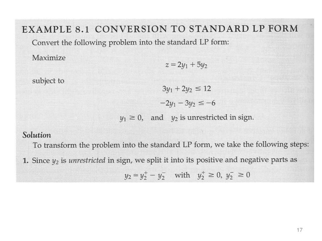 Std Form LP Problem Matrix form All “=“ All “≥0” i.e. non-neg. How do we transform an given LP problem into a Standard LP Prob.?