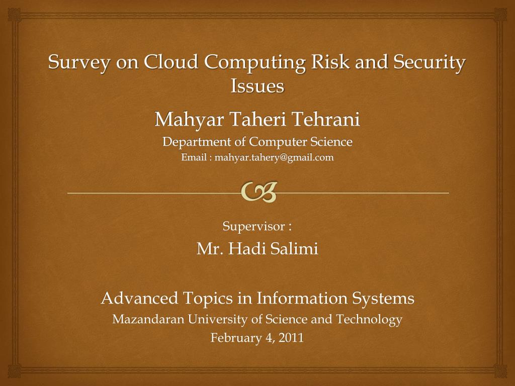 Survey on Cloud Computing Risk and Security Issues. Mahyar Taheri Tehrani Department of Computer Science Email : mahyar.tahery@gmail.com. Supervisor : Mr. Hadi Salimi Advanced Topics in Information Systems Mazandaran University of Science and Technology February 4, 2011.
