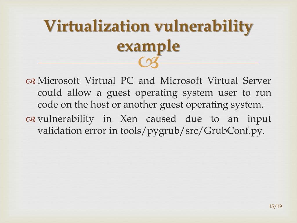 Virtualization vulnerability example • Microsoft Virtual PC and Microsoft Virtual Server could allow a guest operating system user to run code on the host or another guest operating system. • vulnerability in Xen caused due to an input validation error in tools/pygrub/src/GrubConf.py.