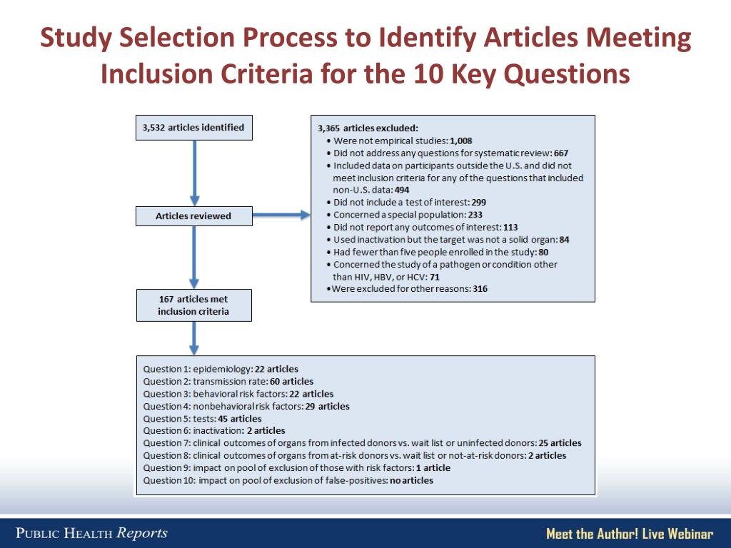 Preliminary Literature Search to Support Questions for Systematic Review • Review of 1994 PHS guideline as basis for revision • Literature search with the following assumptions • Focus on solid organ transplantation • Focus on HIV, HBV, and HCV transmission • Retain current guideline structure, focusing on behavior/medical history interview, clinical data, and laboratory testing for risk assessment • Recognize the potential risks of new recommendations, as well as potential benefits