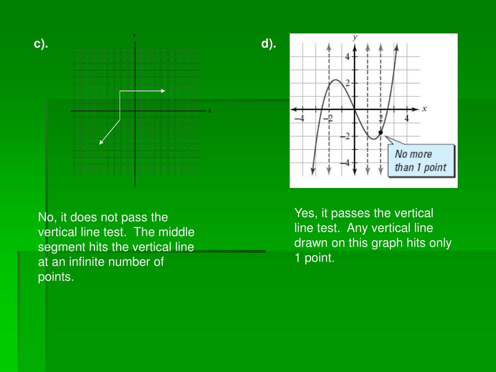c). d). Yes, it passes the vertical line test. Any vertical line drawn on this graph hits only 1 point. No, it does not pass the vertical line test. The middle segment hits the vertical line at an infinite number of points.
