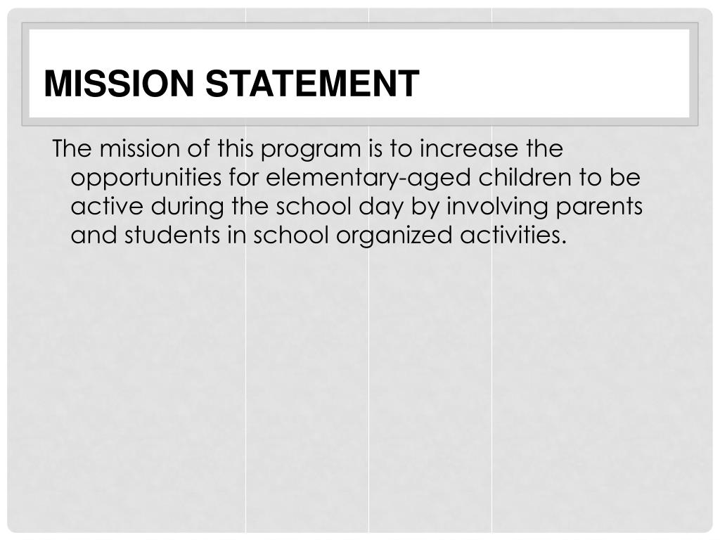 Mission Statement The mission of this program is to increase the opportunities for elementary-aged children to be active during the school day by involving parents and students in school organized activities.