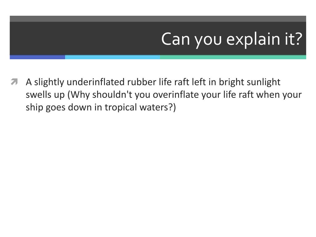Can you explain it? • A slightly underinflated rubber life raft left in bright sunlight swells up (Why shouldn't you overinflate your life raft when your ship goes down in tropical waters?)