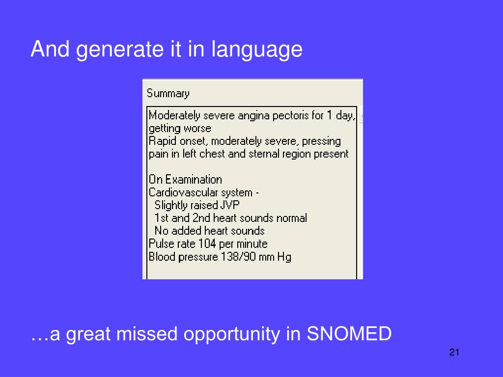 Early computer systems Aimed at saving space on early computers 1-5 Mbyte / 10,000 patients Read (1987 - 1995) Hierarchical modelled on ICD9 Detailed signs and symptoms for primary care Purchased by UK government in 1990 Single use Medical Entities Dictionary (MED) Jim Cimino, Hospital support, Columbia, USA OXMIS READ competitor Flat list of codes Derived from empirical data Defunct circa 1999 ICPC Epidemiologically tested, Dutch LOINC For laboratory data DICOM (sdm) For images MEDDRA Adverse Reactions … and then with computersDocumenting/Reporting Care
