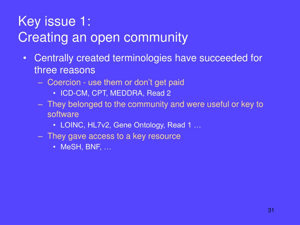 Key issue 1: Creating an open community • Centrally created terminologies have succeeded for three reasons • Coercion - use them or don’t get paid • ICD-CM, CPT, MEDDRA, Read 2 • They belonged to the community and were useful or key to software • LOINC, HL7v2, Gene Ontology, Read 1 … • They gave access to a key resource • MeSH, BNF, …