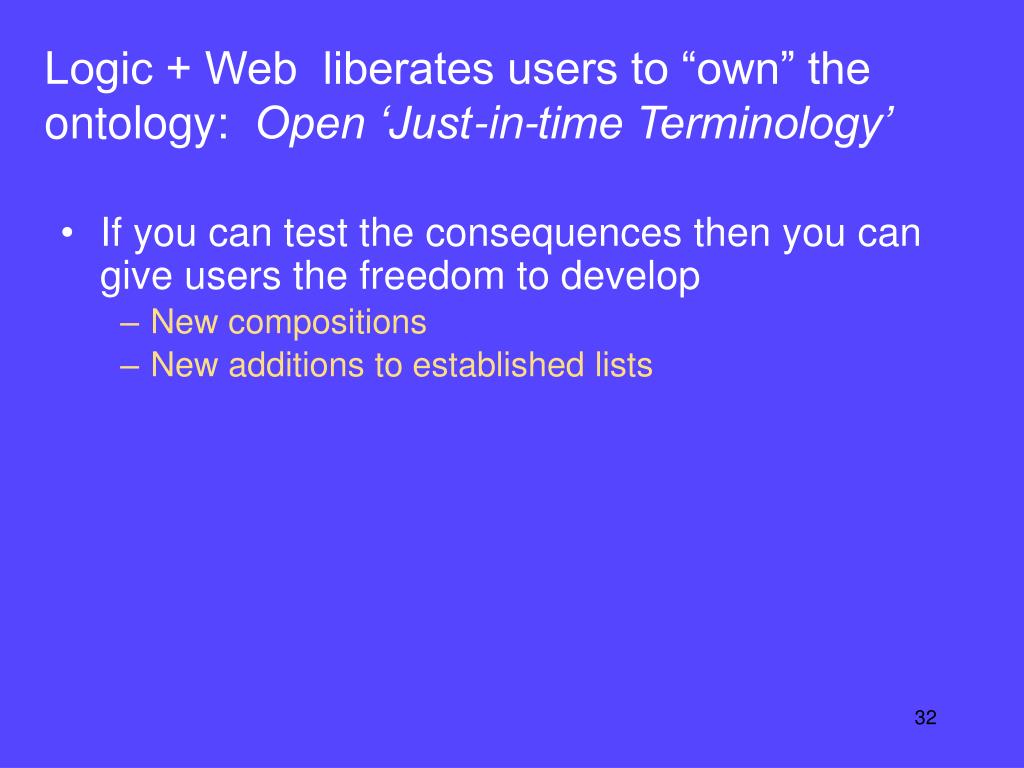 Logic + Web liberates users to “own” the ontology: Open ‘Just-in-time Terminology’ • If you can test the consequences then you can give users the freedom to develop • New compositions • New additions to established lists