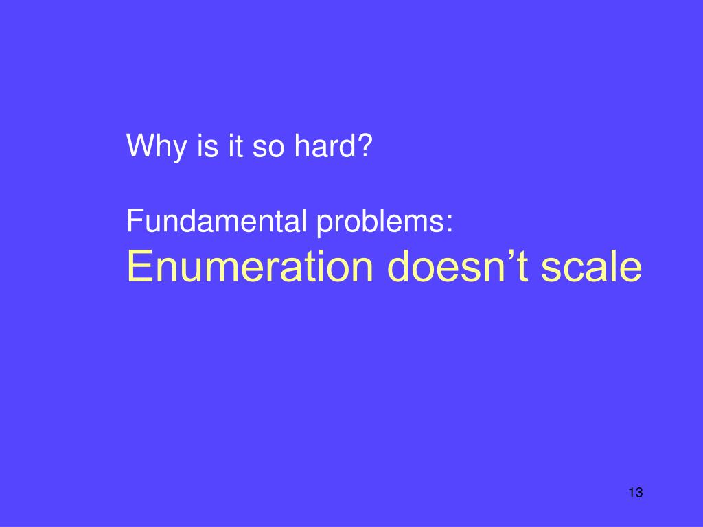 Why is it so hard?Fundamental problems:Enumeration doesn’t scale
