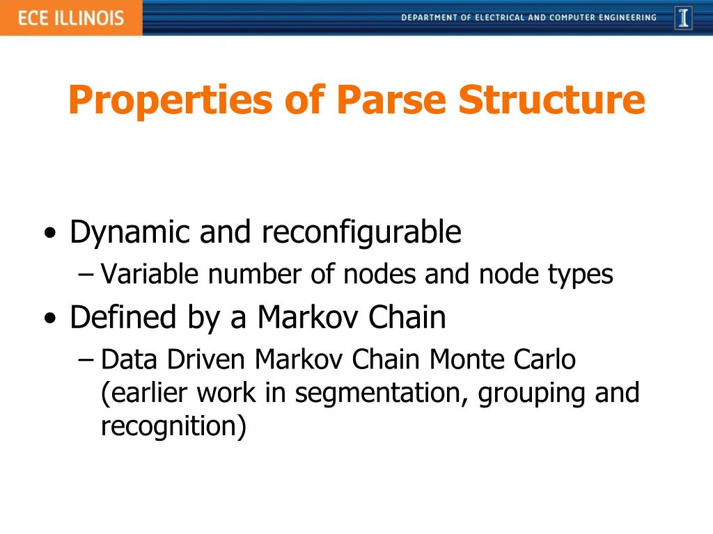 Properties of Parse Structure • Dynamic and reconfigurable • Variable number of nodes and node types • Defined by a Markov Chain • Data Driven Markov Chain Monte Carlo (earlier work in segmentation, grouping and recognition)