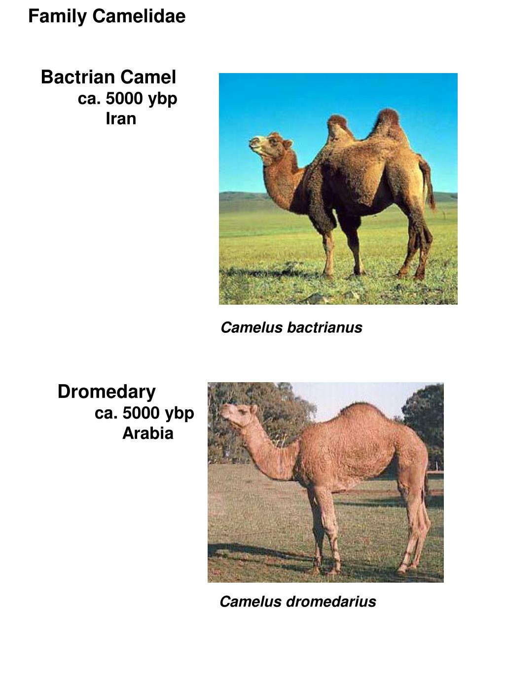 Bactrian Camel ca. 5000 ybp Iran Camelus bactrianus Dromedary ca. 5000 ybp Arabia Camelus dromedarius Family Camelidae