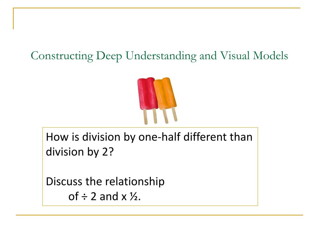 Constructing Deep Understanding and Visual Models How is division by one-half different than division by 2? Discuss the relationship of ÷ 2 and x ½.