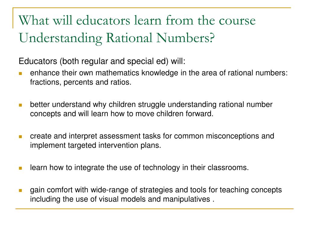 What will educators learn from the course Understanding Rational Numbers? Educators (both regular and special ed) will: enhance their own mathematics knowledge in the area of rational numbers: fractions, percents and ratios. better understand why children struggle understanding rational number concepts and will learn how to move children forward. create and interpret assessment tasks for common misconceptions and implement targeted intervention plans. learn how to integrate the use of technology in their classrooms. gain comfort with wide-range of strategies and tools for teaching concepts including the use of visual models and manipulatives .