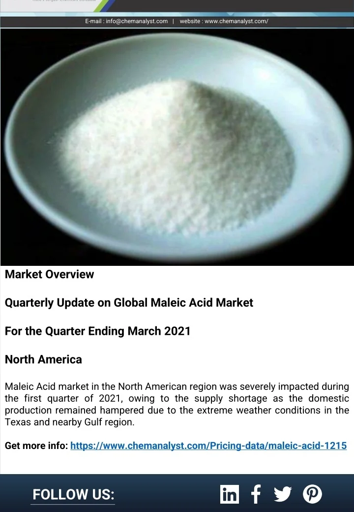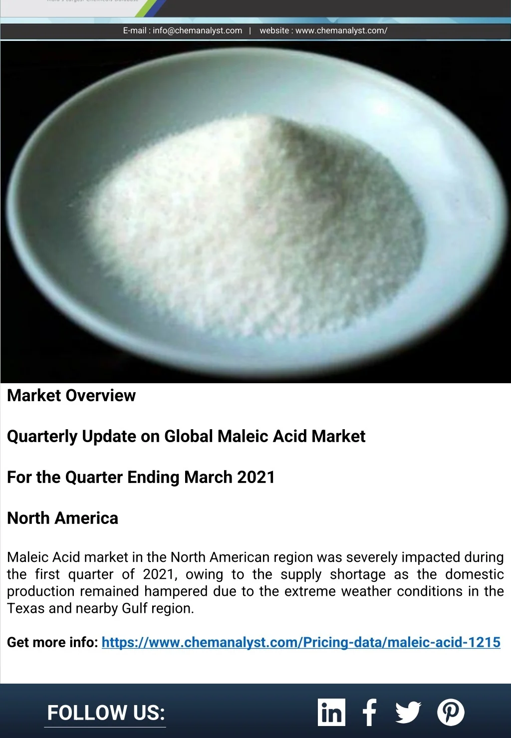 E-mail : info@chemanalyst.com | website : www.chemanalyst.com/ Market Overview Quarterly Update on Global Maleic Acid Market For the Quarter Ending March 2021 North America Maleic Acid market in the North American region was severely impacted during the first quarter of 2021, owing to the supply shortage as the domestic production remained hampered due to the extreme weather conditions in the Texas and nearby Gulf region. Get more info: https://www.chemanalyst.com/Pricing-data/maleic-acid-1215 FOLLOW US: