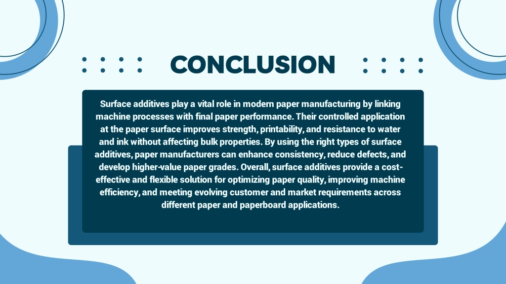 CONCLUSION Surface additives play a vital role in modern paper manufacturing by linking machine processes with final paper performance. Their controlled application at the paper surface improves strength, printability, and resistance to water and ink without affecting bulk properties. By using the right types of surface additives, paper manufacturers can enhance consistency, reduce defects, and develop higher-value paper grades. Overall, surface additives provide a cost-effective and flexible solution for optimizing paper quality, improving machine efficiency, and meeting evolving customer and market requirements across different paper and paperboard applications.