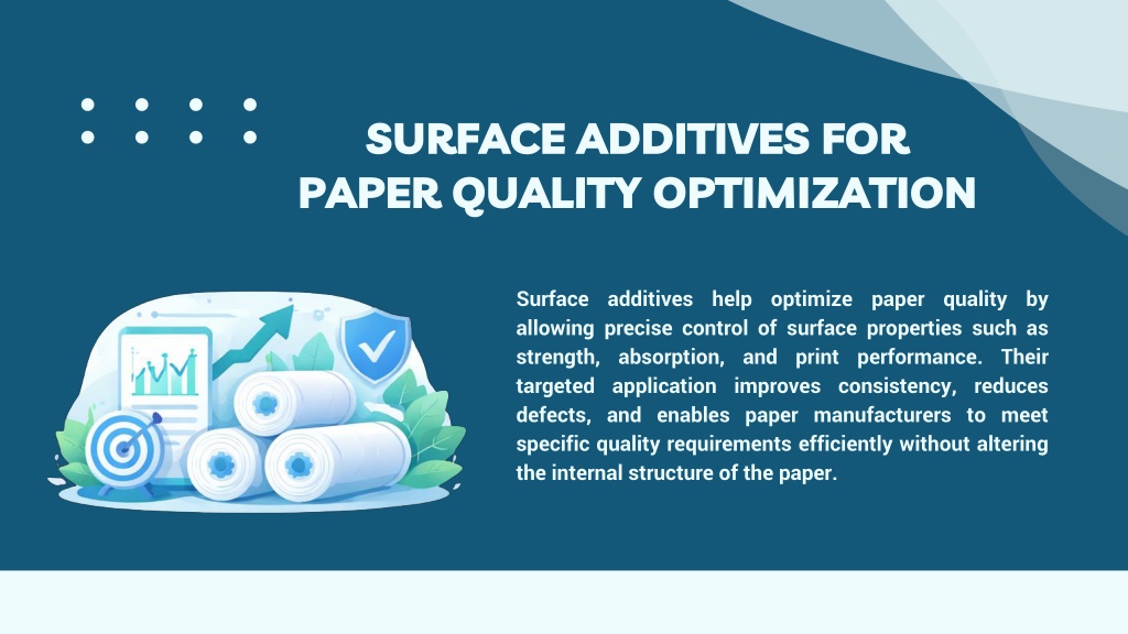 SURFACE ADDITIVES FOR PAPER QUALITY OPTIMIZATION Surface additives help optimize paper quality by allowing precise control of surface properties such as strength, absorption, and print performance. Their targeted application improves consistency, reduces defects, and enables paper manufacturers to meet specific quality requirements efficiently without altering the internal structure of the paper.