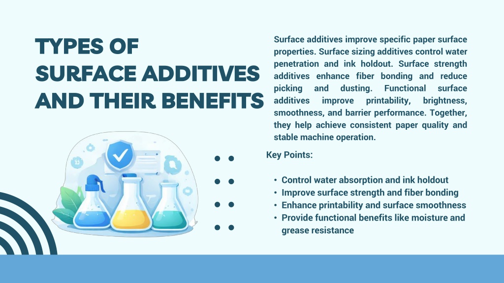 Surface additives improve specific paper surface properties. Surface sizing additives control water penetration and ink holdout. Surface strength additives enhance fiber bonding and reduce picking and dusting. Functional surface additives improve printability, brightness, smoothness, and barrier performance. Together, they help achieve consistent paper quality and stable machine operation. TYPES OF SURFACE ADDITIVES AND THEIR BENEFITS • Key Points: • Control water absorption and ink holdout • Improve surface strength and fiber bonding • Enhance printability and surface smoothness • Provide functional benefits like moisture and grease resistance