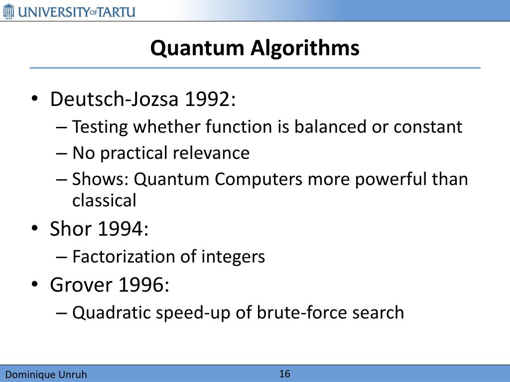Quantum Algorithms • Deutsch-Jozsa 1992: • Testing whether function is balanced or constant • No practical relevance • Shows: Quantum Computers more powerful than classical • Shor 1994: • Factorization of integers • Grover 1996: • Quadratic speed-up of brute-force search