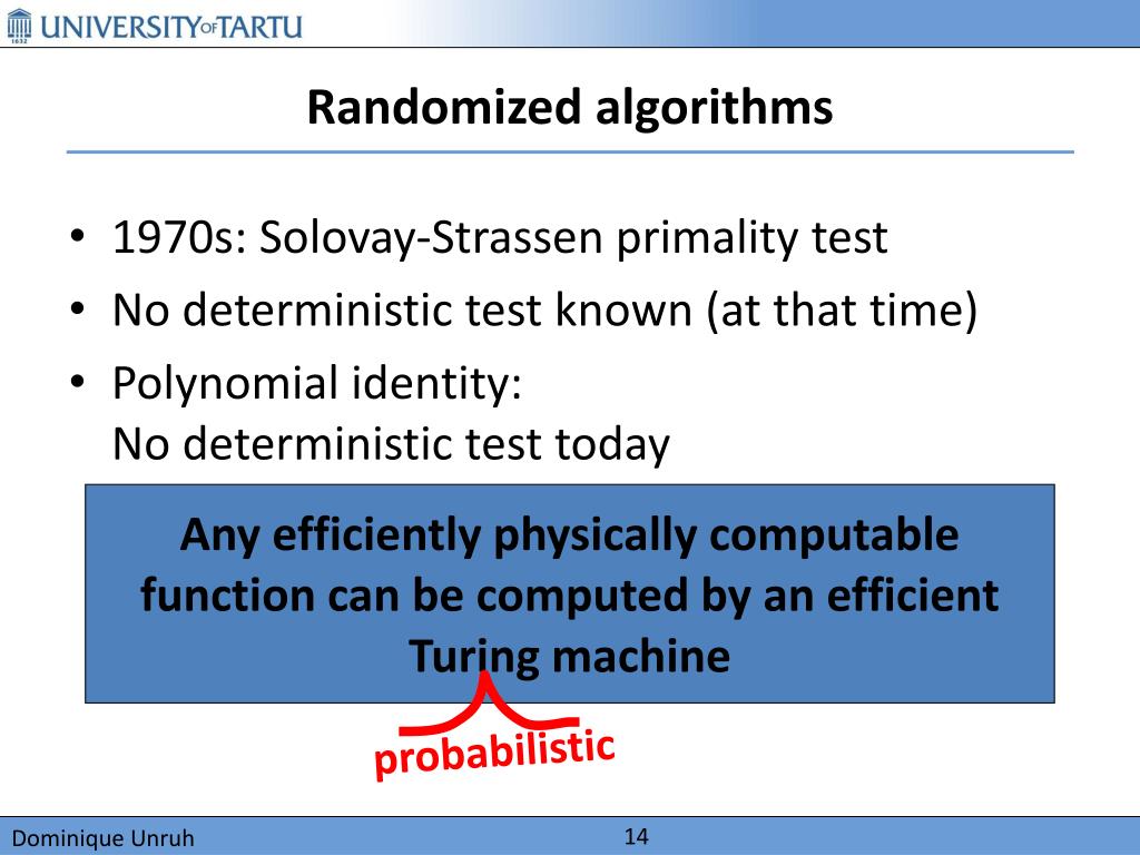 Randomized algorithms • 1970s: Solovay-Strassen primality test • No deterministic test known (at that time) • Polynomial identity:No deterministic test today Any efficiently physically computable function can be computed by an efficient Turing machine probabilistic