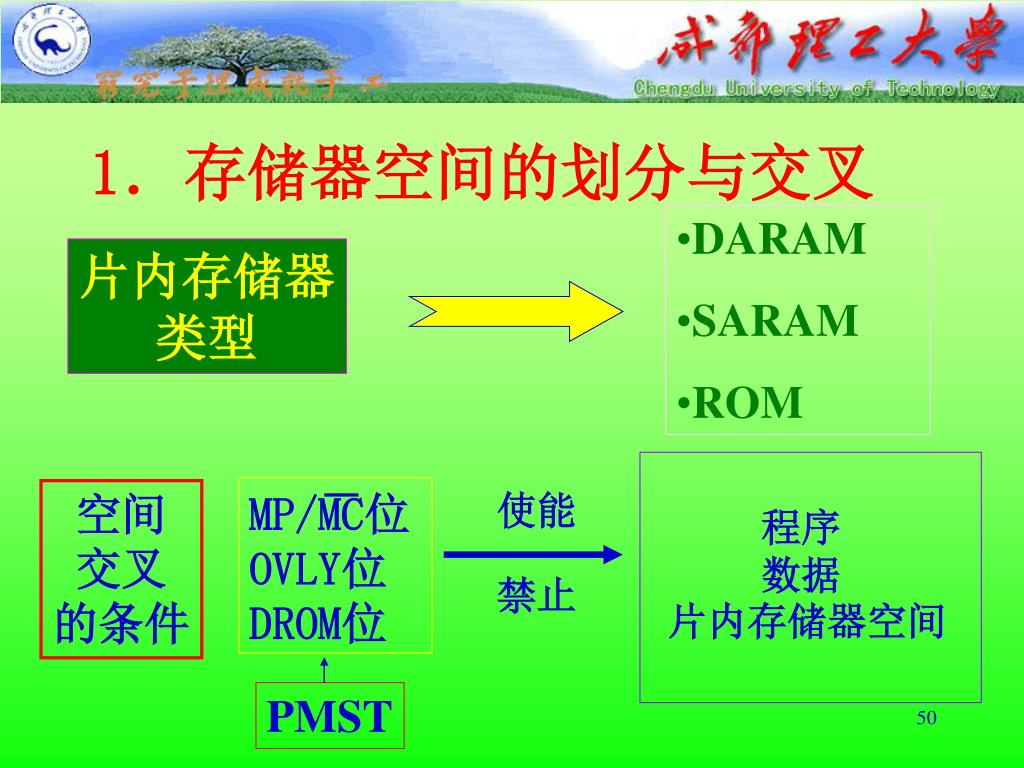 程序 数据 片内存储器空间 1.存储器空间的划分与交叉 • DARAM • SARAM • ROM 片内存储器 类型 MP/MC位OVLY位 DROM位 使能 空间 交叉 的条件 禁止 PMST