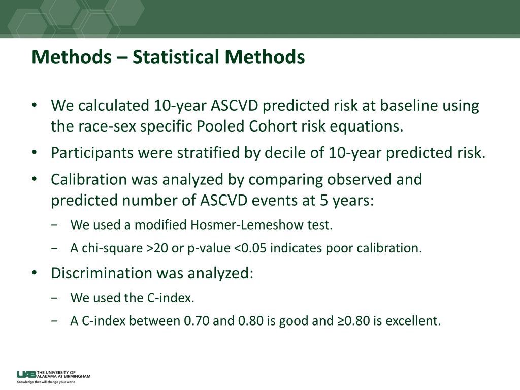 Methods – Statistical Methods • We calculated 10-year ASCVD predicted risk at baseline using the race-sex specific Pooled Cohort risk equations. • Participants were stratified by decile of 10-year predicted risk. • Calibration was analyzed by comparing observed and predicted number of ASCVD events at 5 years: • We used a modified Hosmer-Lemeshow test. • A chi-square >20 or p-value <0.05 indicates poor calibration. • Discrimination was analyzed: • We used the C-index. • A C-index between 0.70 and 0.80 is good and ≥0.80 is excellent.