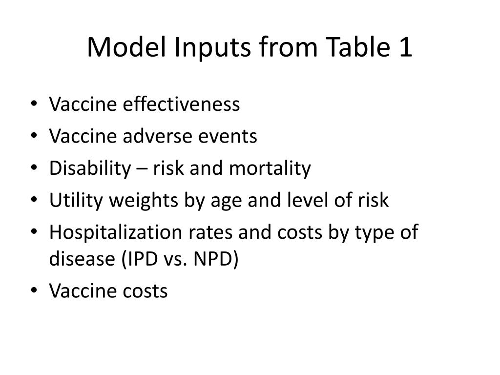Model Inputs from Table 1 • Vaccine effectiveness • Vaccine adverse events • Disability – risk and mortality • Utility weights by age and level of risk • Hospitalization rates and costs by type of disease (IPD vs. NPD) • Vaccine costs