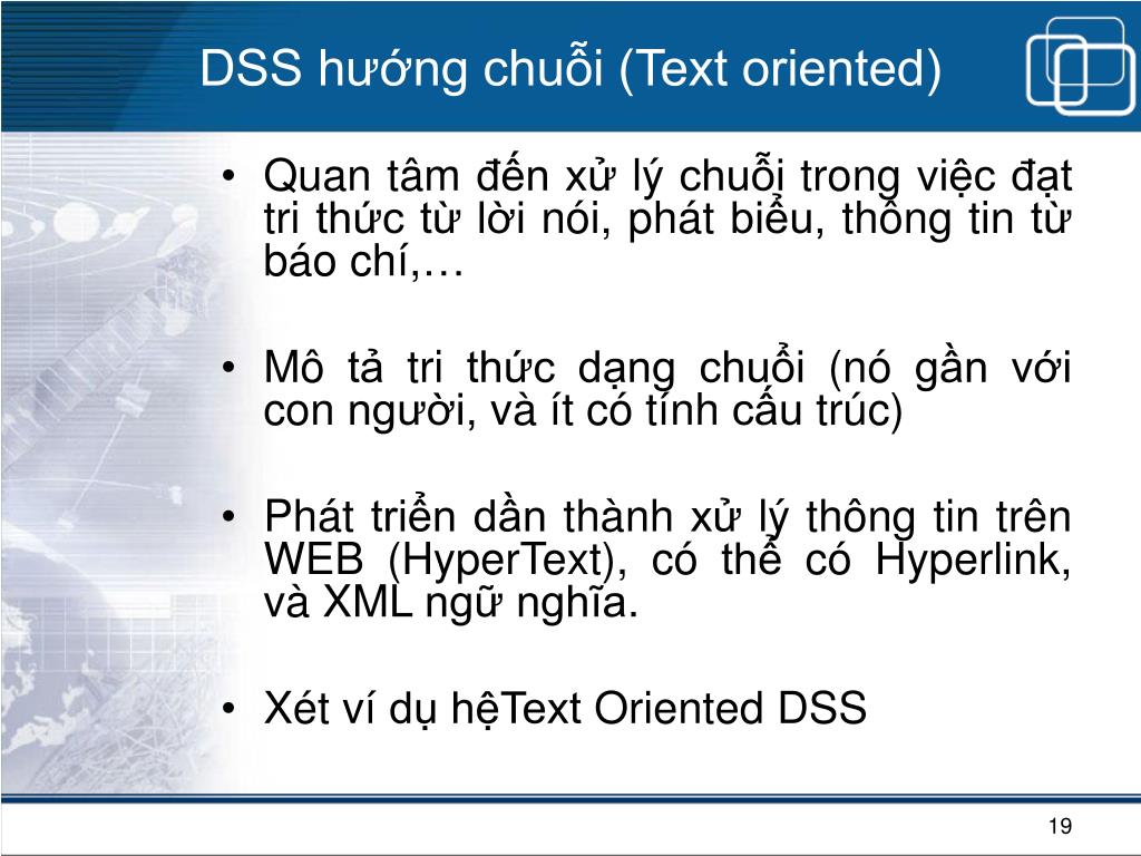 DSS hướng chuỗi (Text oriented) • Quan tâm đến xử lý chuỗi trong việc đạt tri thức từ lời nói, phát biểu, thông tin từ báo chí,… • Mô tả tri thức dạng chuổi (nó gần với con người, và ít có tính cấu trúc) • Phát triển dần thành xử lý thông tin trên WEB (HyperText), có thể có Hyperlink, và XML ngữ nghĩa. • Xét ví dụ hệText Oriented DSS