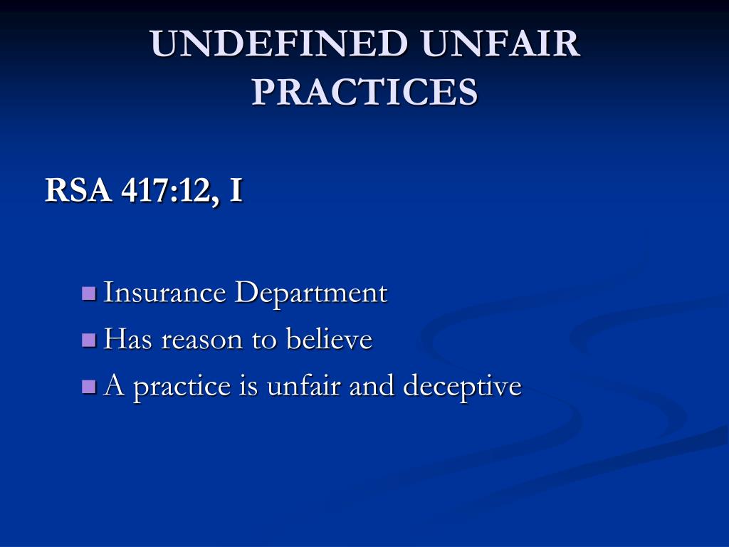 UNDEFINED UNFAIR PRACTICES RSA 417:12, I • Insurance Department • Has reason to believe • A practice is unfair and deceptive