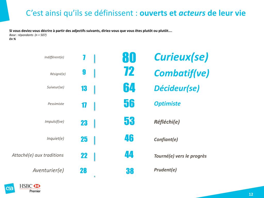 C’est ainsi qu’ils se définissent : ouverts et acteurs de leur vie Si vous deviez vous décrire à partir des adjectifs suivants, diriez-vous que vous êtes plutôt ou plutôt…. Base : répondants (n = 507) En % 80 Curieux(se) 7 Indifférent(e) 72 Combatif(ve) 9 Résigné(e) 64 Décideur(se) 13 Suiveur(se) 56 Optimiste 17 Pessimiste 53 Réfléchi(e) 23 Impulsif(ve) 46 25 Inquiet(e) Confiant(e) 44 22 Attaché(e) aux traditions Tourné(e) vers le progrès Aventurier(e) 28 38 Prudent(e) 28%