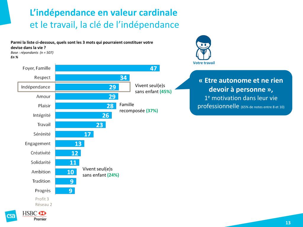 L’indépendance en valeur cardinale • et le travail, la clé de l’indépendance Parmi la liste ci-dessous, quels sont les 3 mots qui pourraient constituer votre devise dans la vie ? Base : répondants (n = 507) En % Votre travail « Etre autonome et ne rien devoir à personne », 1e motivation dans leur vie professionnelle (65% de notes entre 8 et 10) Profit 3 Réseau 2