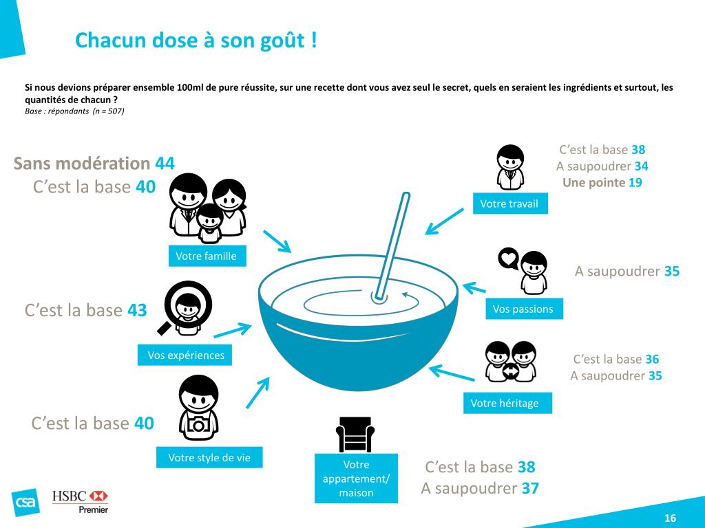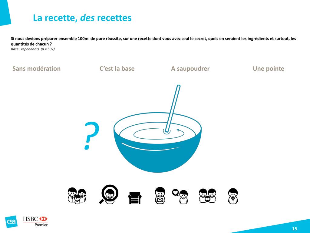 La recette, des recettes Si nous devions préparer ensemble 100ml de pure réussite, sur une recette dont vous avez seul le secret, quels en seraient les ingrédients et surtout, les quantités de chacun ? Base : répondants (n = 507) Sans modération C’est la base A saupoudrer Une pointe ?