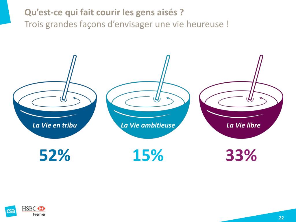 Qu’est-ce qui fait courir les gens aisés ? • Trois grandes façons d’envisager une vie heureuse ! La Vie en tribu La Vie ambitieuse La Vie libre 52% 15% 33%
