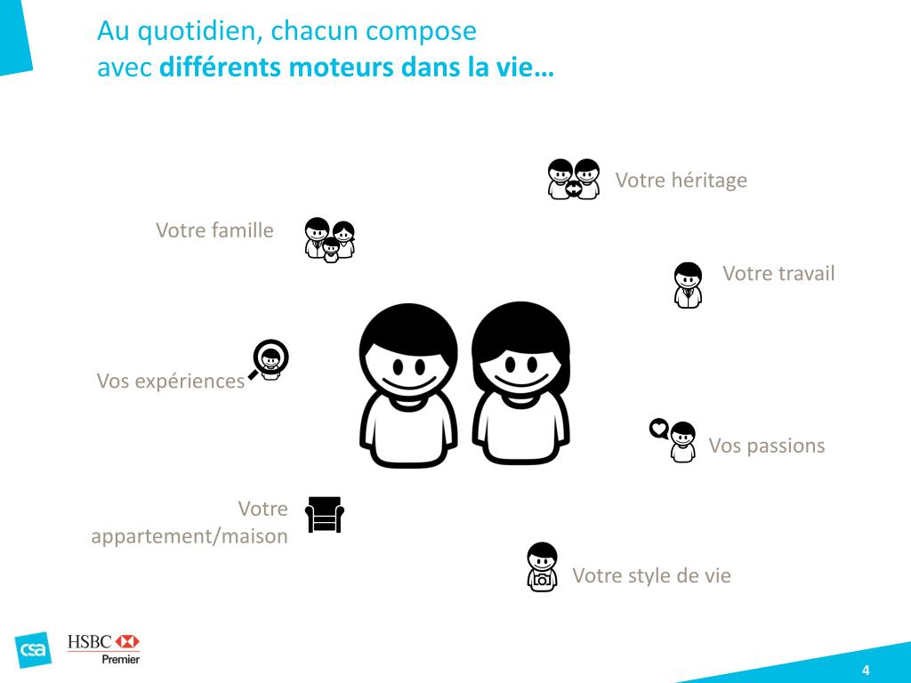 Au quotidien, chacun compose • avec différents moteurs dans la vie… Votre héritage Votre famille Votre travail Vos expériences Vos passions Votre appartement/maison Votre style de vie