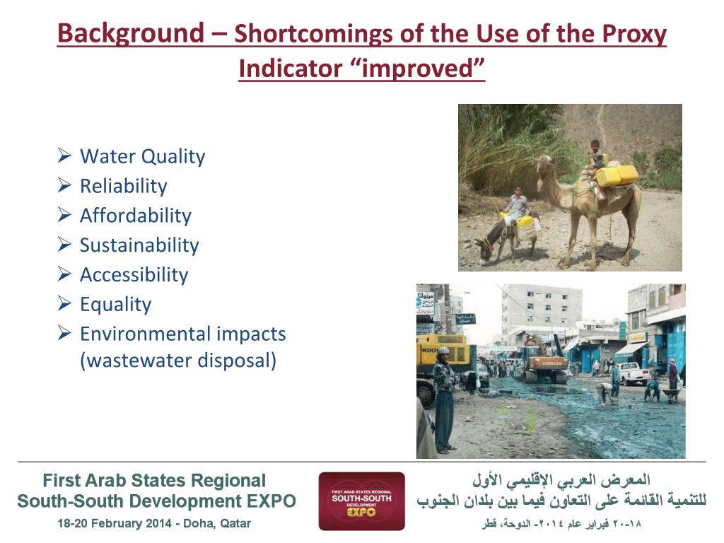 Background –Shortcomings of the Use of the Proxy Indicator “improved” • Water Quality • Reliability • Affordability • Sustainability • Accessibility • Equality • Environmental impacts(wastewater disposal)