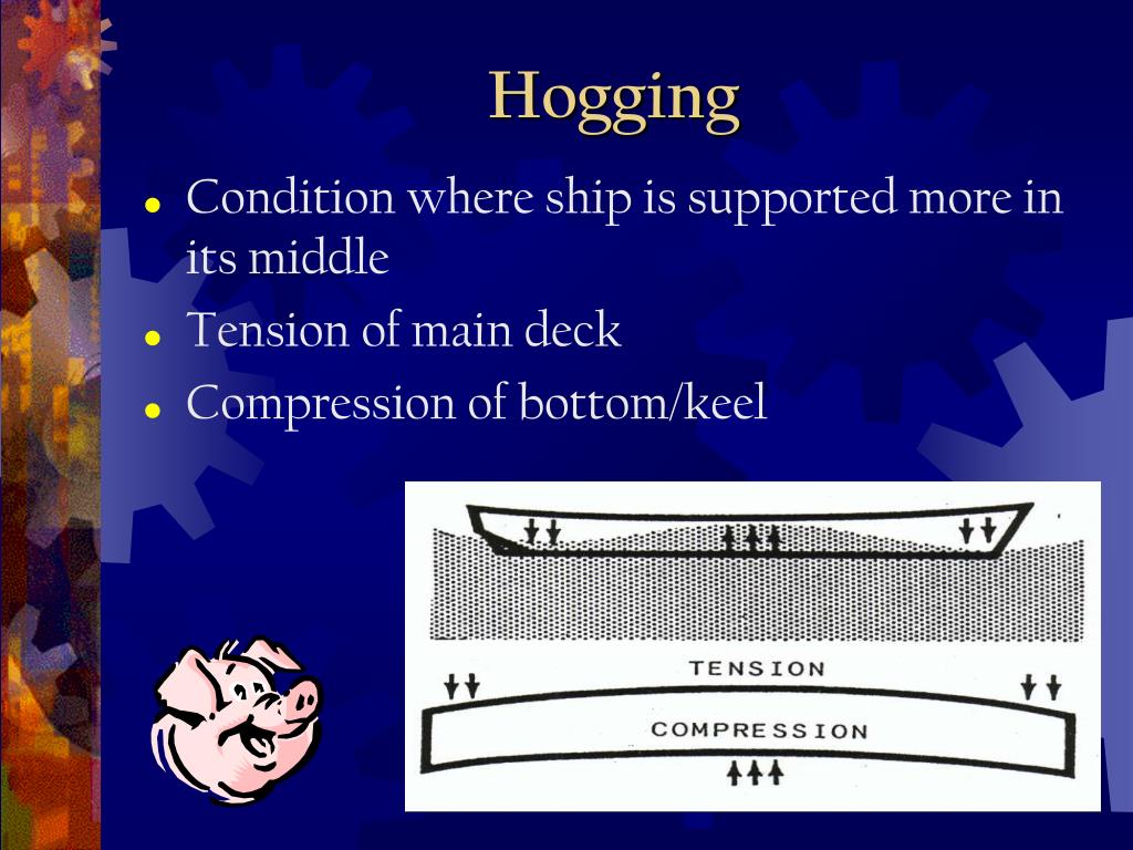 Hogging • Condition where ship is supported more in its middle • Tension of main deck • Compression of bottom/keel