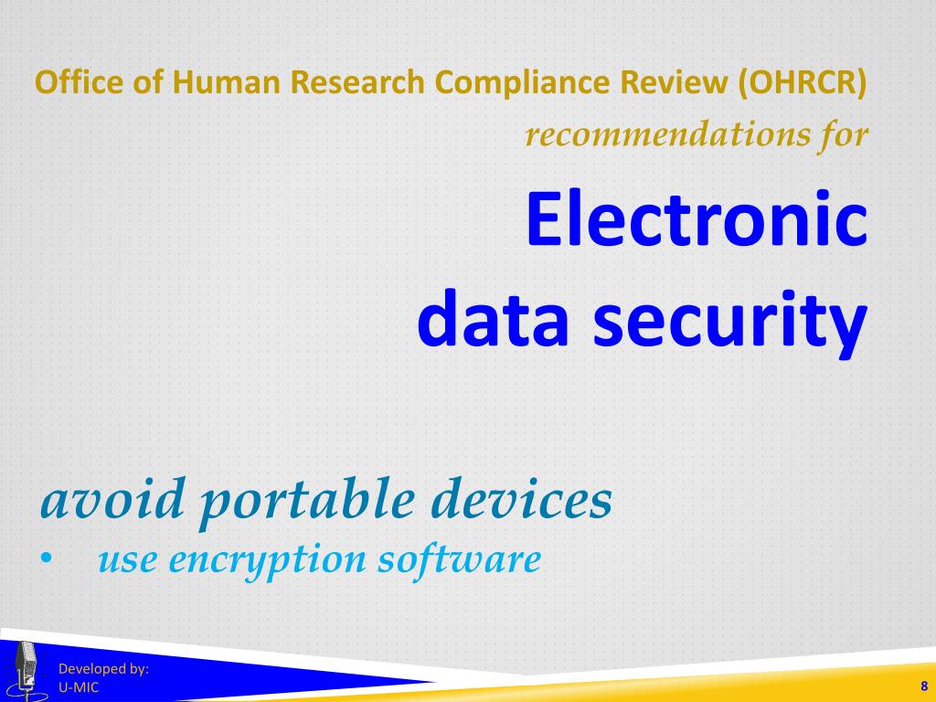 Office of Human Research Compliance Review (OHRCR) recommendations for Electronic data security • avoid portable devices • use encryption software Developed by: U-MIC