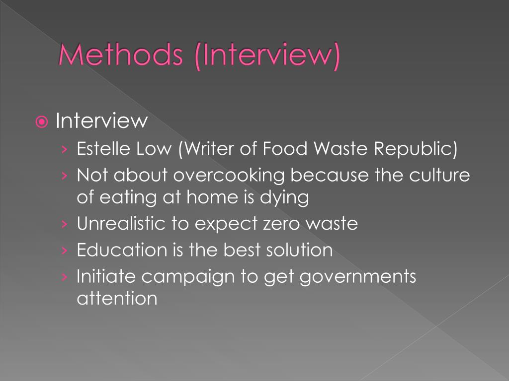 Methods (Interview) • Interview • Estelle Low (Writer of Food Waste Republic) • Not about overcooking because the culture of eating at home is dying • Unrealistic to expect zero waste • Education is the best solution • Initiate campaign to get governments attention