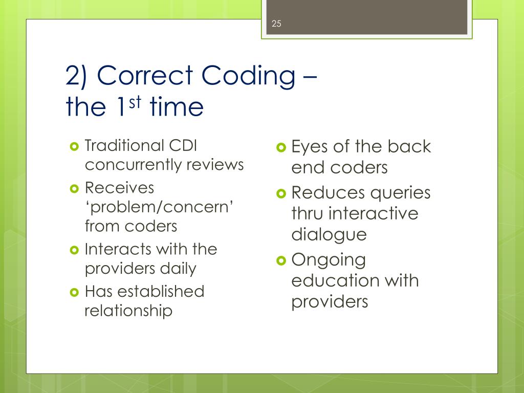 2) Correct Coding – the 1st time • Traditional CDI concurrently reviews • Receives ‘problem/concern’ from coders • Interacts with the providers daily • Has established relationship • Eyes of the back end coders • Reduces queries thru interactive dialogue • Ongoing education with providers