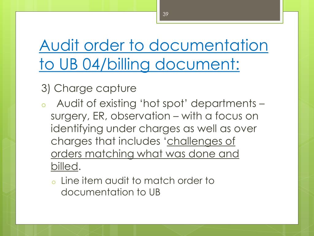 Audit order to documentation to UB 04/billing document: 3) Charge capture • Audit of existing ‘hot spot’ departments – surgery, ER, observation – with a focus on identifying under charges as well as over charges that includes ‘challenges of orders matching what was done and billed. • Line item audit to match order to documentation to UB