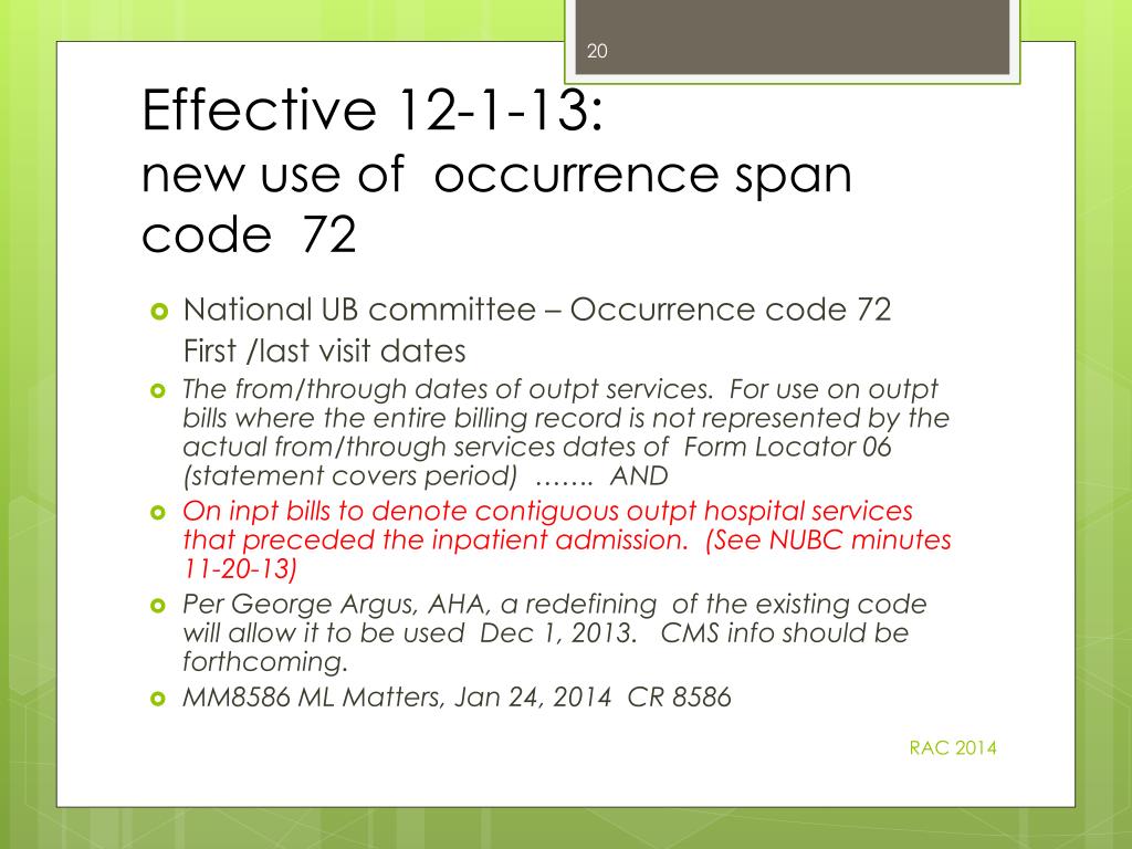 Effective 12-1-13: new use of occurrence span code 72 • National UB committee – Occurrence code 72 First /last visit dates • The from/through dates of outpt services. For use on outpt bills where the entire billing record is not represented by the actual from/through services dates of Form Locator 06 (statement covers period) ……. AND • On inpt bills to denote contiguous outpt hospital services that preceded the inpatient admission. (See NUBC minutes 11-20-13) • Per George Argus, AHA, a redefining of the existing code will allow it to be used Dec 1, 2013. CMS info should be forthcoming. • MM8586 ML Matters, Jan 24, 2014 CR 8586 RAC 2014