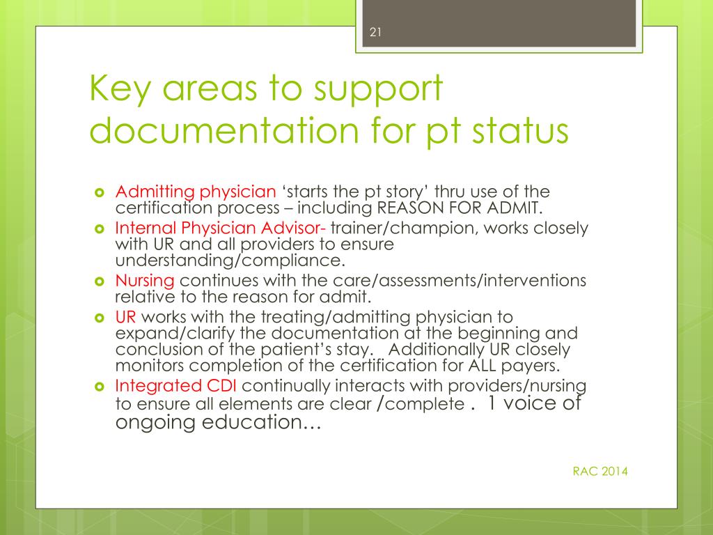 Key areas to support documentation for pt status • Admitting physician ‘starts the pt story’ thru use of the certification process – including REASON FOR ADMIT. • Internal Physician Advisor- trainer/champion, works closely with UR and all providers to ensure understanding/compliance. • Nursing continues with the care/assessments/interventions relative to the reason for admit. • UR works with the treating/admitting physician to expand/clarify the documentation at the beginning and conclusion of the patient’s stay. Additionally UR closely monitors completion of the certification for ALL payers. • Integrated CDI continually interacts with providers/nursing to ensure all elements are clear /complete . 1 voice of ongoing education… RAC 2014
