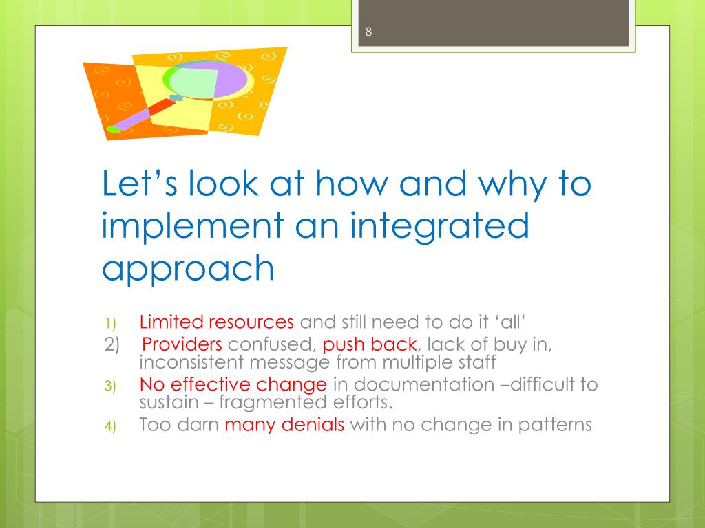 Let’s look at how and why to implement an integrated approach Limited resources and still need to do it ‘all’ 2) Providers confused, push back, lack of buy in, inconsistent message from multiple staff No effective change in documentation –difficult to sustain – fragmented efforts. Too darn many denials with no change in patterns