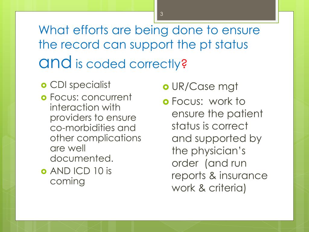 What efforts are being done to ensure the record can support the pt status and is coded correctly? • CDI specialist • Focus: concurrent interaction with providers to ensure co-morbidities and other complications are well documented. • AND ICD 10 is coming • UR/Case mgt • Focus: work to ensure the patient status is correct and supported by the physician’s order (and run reports & insurance work & criteria)