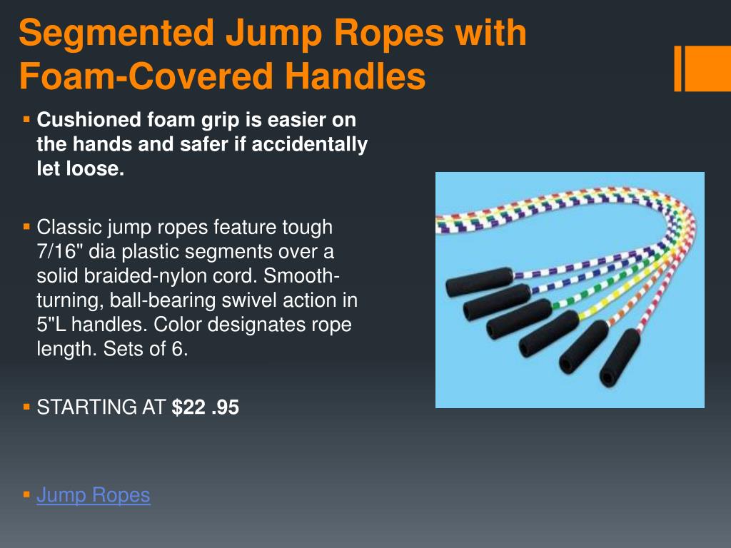 Segmented Jump Ropes with Foam-Covered Handles • Cushioned foam grip is easier on the hands and safer if accidentally let loose. • Classic jump ropes feature tough 7/16" dia plastic segments over a solid braided-nylon cord. Smooth-turning, ball-bearing swivel action in 5"L handles. Color designates rope length. Sets of 6. • STARTING AT $22.95 • Jump Ropes