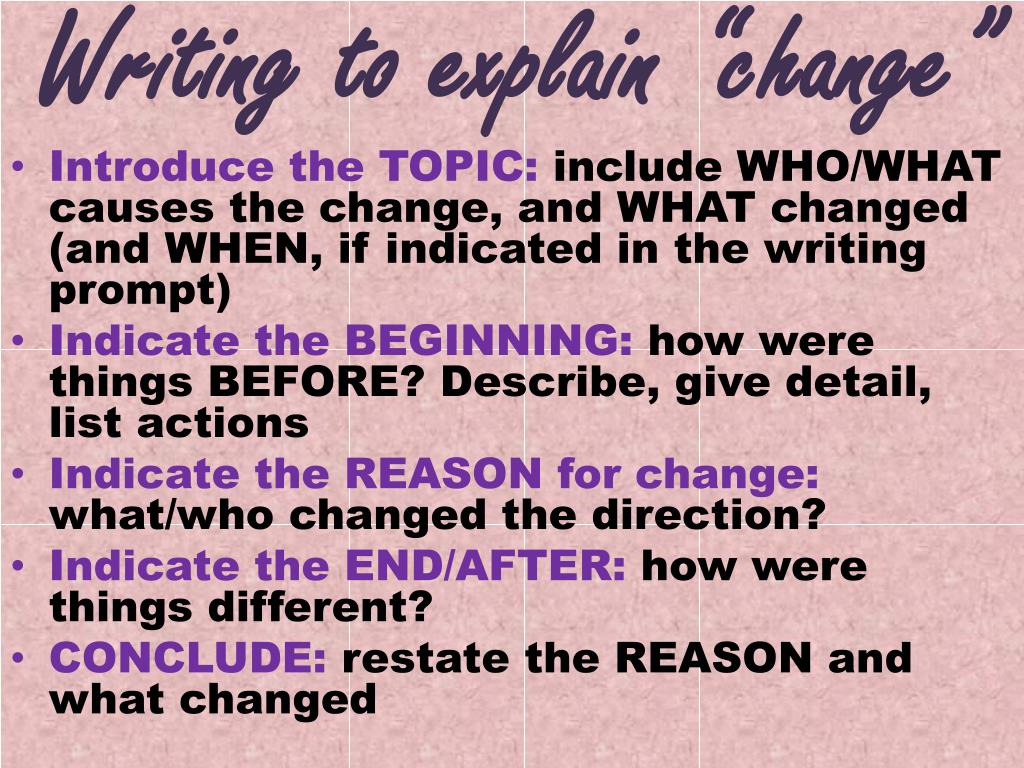 Writing to explain “change” • Introduce the TOPIC: include WHO/WHAT causes the change, and WHAT changed (and WHEN, if indicated in the writing prompt) • Indicate the BEGINNING: how were things BEFORE? Describe, give detail, list actions • Indicate the REASON for change: what/who changed the direction? • Indicate the END/AFTER: how were things different? • CONCLUDE: restate the REASON and what changed