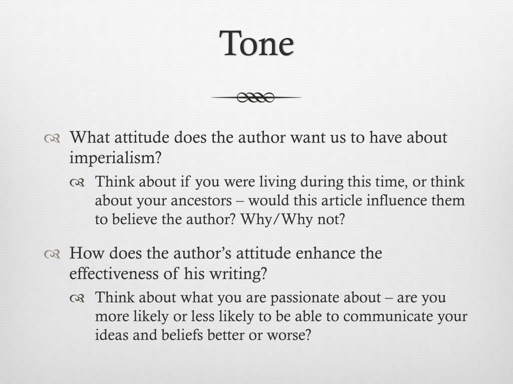 Tone • What attitude does the author want us to have about imperialism? • Think about if you were living during this time, or think about your ancestors – would this article influence them to believe the author? Why/Why not? • How does the author’sattitude enhance the effectiveness of his writing? • Think about what you are passionate about – are you more likely or less likely to be able to communicate your ideas and beliefs better or worse?