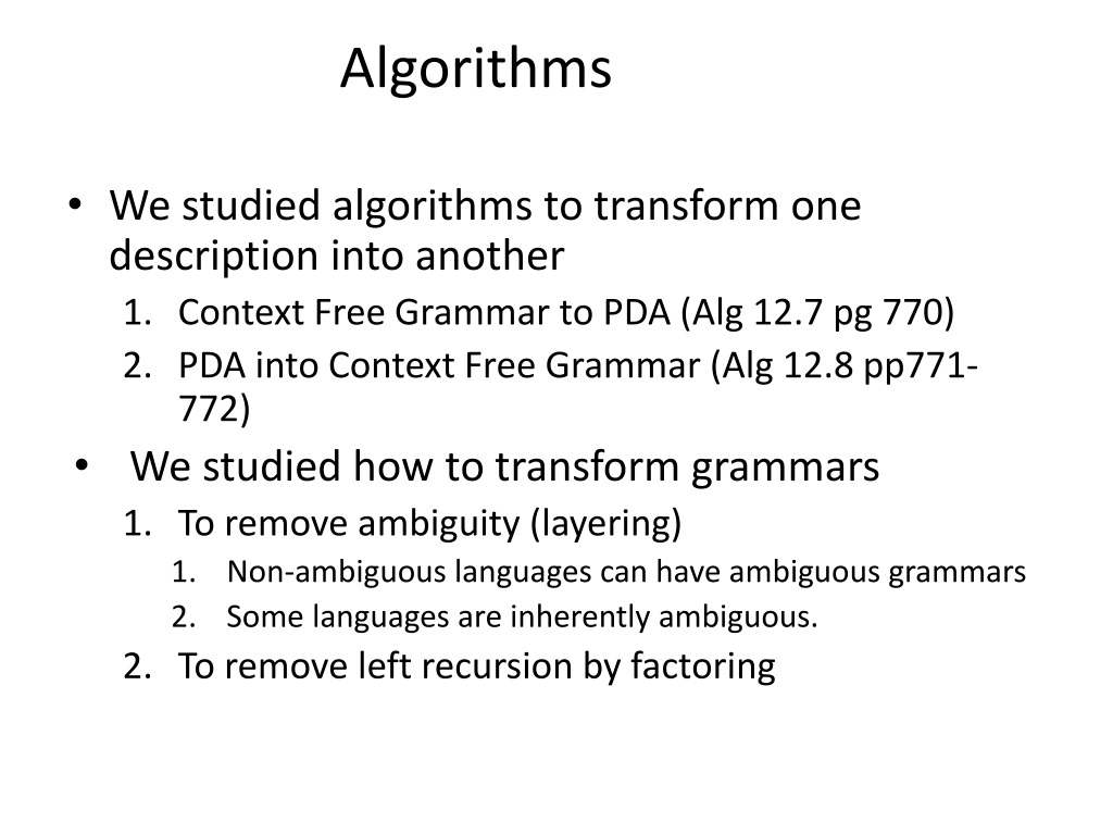 Algorithms • We studied algorithms to transform one description into another • Context Free Grammar to PDA (Alg 12.7 pg 770) • PDA into Context Free Grammar (Alg 12.8 pp771-772) • We studied how to transform grammars • To remove ambiguity (layering) • Non-ambiguous languages can have ambiguous grammars • Some languages are inherently ambiguous. • To remove left recursion by factoring