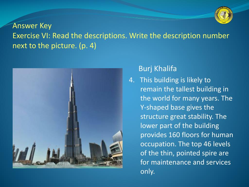 Burj Khalifa 4. This building is likely to remain the tallest building in the world for many years. The Y-shaped base gives the structure great stability. The lower part of the building provides 160 floors for human occupation. The top 46 levels of the thin, pointed spire are for maintenance and services only. Answer KeyExercise VI: Read the descriptions. Write the description number next to the picture. (p. 4)