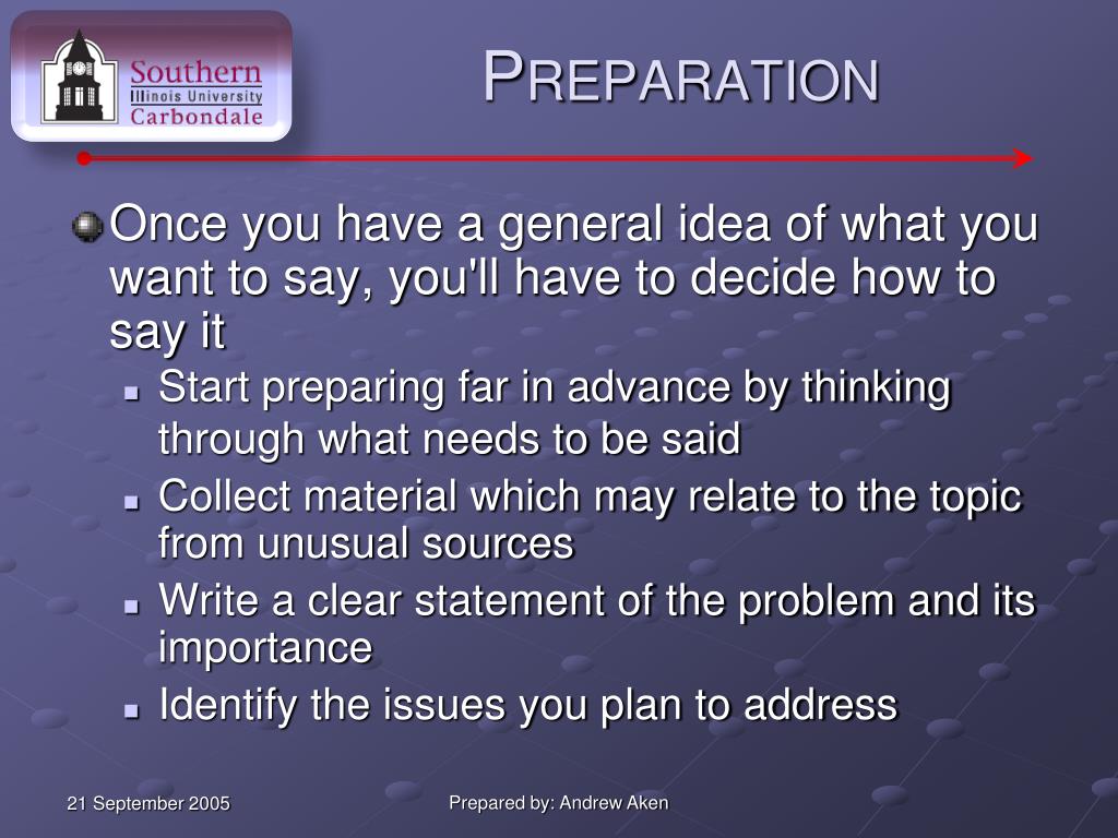 Preparation • Once you have a general idea of what you want to say, you'll have to decide how to say it • Start preparing far in advance by thinking through what needs to be said • Collect material which may relate to the topic from unusual sources • Write a clear statement of the problem and its importance • Identify the issues you plan to address Prepared by: Andrew Aken
