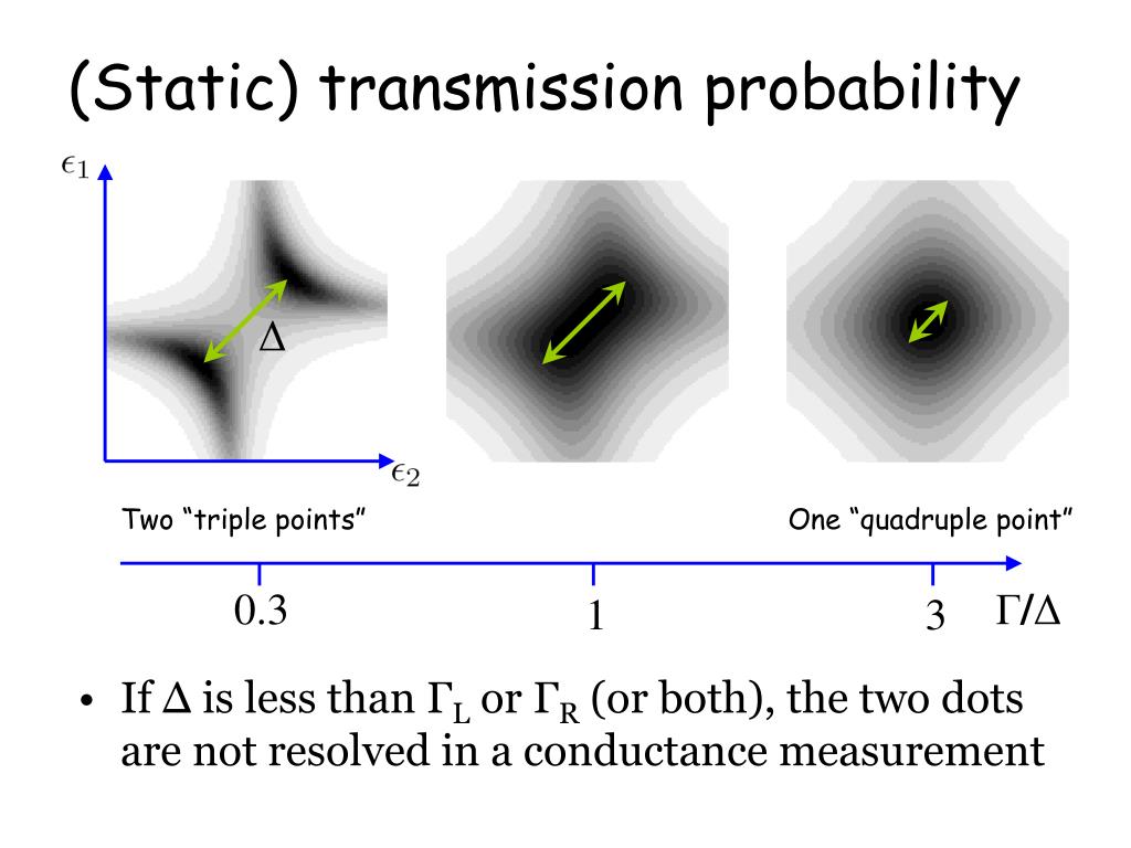 Two “triple points” One “quadruple point” 0.3 Γ/Δ 1 3 (Static) transmission probability • If Δ is less than ΓL or ΓR (or both), the two dots are not resolved in a conductance measurement Δ