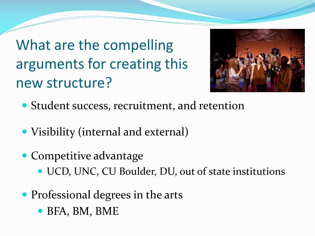 What are the compelling arguments for creating this new structure? • Student success, recruitment, and retention • Visibility (internal and external) • Competitive advantage • UCD, UNC, CU Boulder, DU, out of state institutions • Professional degrees in the arts • BFA, BM, BME